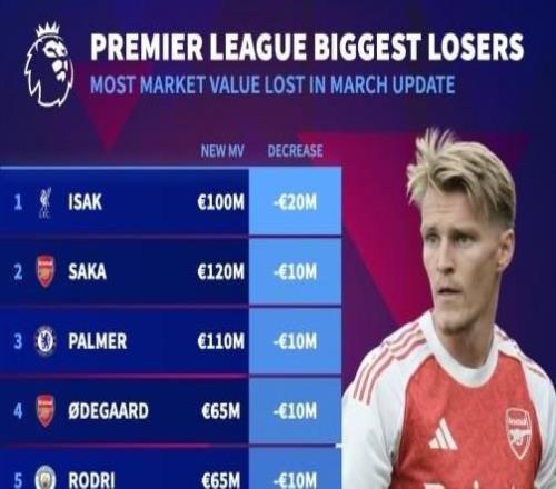 北京時(shí)間3月9日,德轉(zhuǎn)更新英超身價(jià)。其中伊薩克下跌2000萬(wàn)歐來(lái)到1億歐元,薩卡、帕爾默、厄德高、羅德里各下跌1...