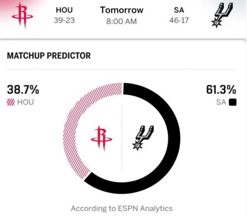 火箭雖在上場勝開拓者時,解鎖阿門與申京拆分使用、謝潑德打組織的高效戰(zhàn)術(shù),但烏度卡此役延續(xù)常規(guī)首發(fā),史密斯、杜蘭特、申京、伊森、阿門,陣容兼容問題再度備受考驗。烏度卡如何調(diào)整去削弱文班的壓制力,成為火箭取勝關(guān)鍵,整體來看馬刺實力更占優(yōu)。賽前,ESPN勝率預(yù)測:火箭贏球概率低至38.7%,馬刺贏球概率則到達(dá)61.3%!
